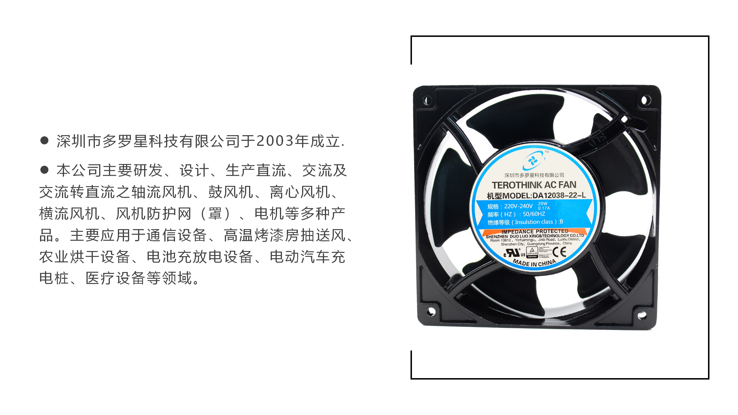 深圳市多羅星科技有限公司成立于2003年,以高品質(zhì)、優(yōu)質(zhì)服務和高性價比屹立行業(yè)十數(shù)載。經(jīng)過多年發(fā)展,廣納高級人才,從單純的散熱方案提供商升級為提供各種特殊散熱風機,特種耐高溫馬達設計于一體的設計性方案解決公司,被廣大客戶廣泛認同和使用。 公司產(chǎn)品涵蓋軸流風機、離心風機、外轉(zhuǎn)式風機、橫流風機等,擁有發(fā)那科、昭和、施樂百、福佑、EBM等德國、日本、臺灣知名散熱廠商品牌的代理及經(jīng)銷權。研發(fā)團隊為多家外資商用設備及南方電網(wǎng),國家電網(wǎng),中國中車等等提供各種變頻,可調(diào)速,耐高溫以及超耐高溫馬達產(chǎn)品。我們以“專注品質(zhì),用心服務”為核心價值,秉承以用戶需求為依歸,致力于技術創(chuàng)新和平臺化運營,通過不斷提升專業(yè)水平和不懈努力,讓客戶以高性價比、快速搭配出完善的散熱和調(diào)速馬達方案。